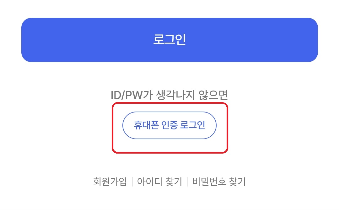 화면 중간에 있는 파란색 '로그인' 버튼 아래를 보세요. 흰색 바탕에 '휴대폰 인증 로그인'이라는 버튼이 보이시죠? 비밀번호 대신 내 핸드폰 번호로 인증 번호를 받아서 바로 로그인할 수 있는 아주 편한 기능입니다.